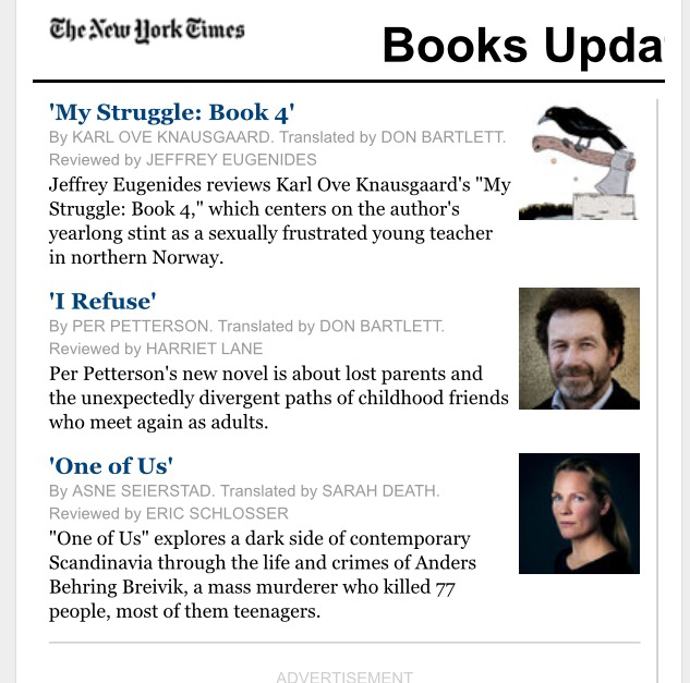 Jeg kan ikke riste av meg mistanken om at det vi her har å gjøre med, er at Norge har blitt et fenomen i New York, og at vår litteratur leses med fascinerte øyne gjennom eksotiserende brilleglass. Mistanken styrkes av at NYT’s boknyhetsbrev denne uken ikke bare har Seierstad på menyen, men hele tre nordmenn på topp: