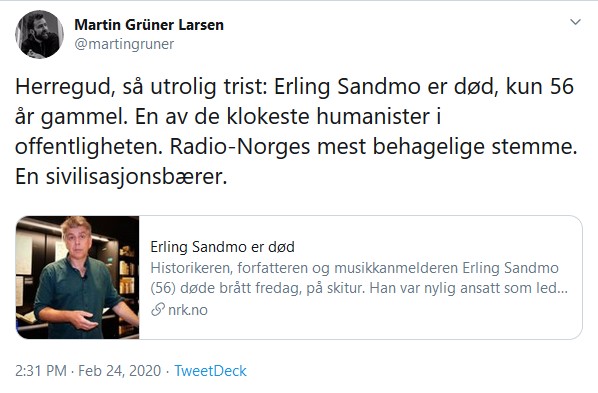 Erling Sandmo er død. Han var den beste kritikeren vi har hatt på radio i Norge. At han var en fantastisk musikkskribent vet alle som har lest hans artikler fra Morgenbladet, men det var som vert for P2s musikkprogram På sporet at han virkelig utmerket seg (den egentlige jobben, historikergjerningen, skal jeg ikke si noe om her). Den utrolige nærheten som oppsto mellom musikken og hans innlevende, men kritiske kommentarer, er ulikt noe annet jeg har hørt. I samtale med Kjell Hillveg eller Nina Krohn, og siden Ragnhild Veire, var han med å gjøre den kritiske dialogen til den sentrale radiosjangeren for estetisk kritikk og jeg vil hevde at ingen har gjort det bedre enn dem. En sentral bestanddel i disse samtalene var Sandmos vilje og evne til å tenke mens han snakket. Det var ikke alltid at resonnementene landet, selv om de bemerkelsesverdig ofte gjorde det, men uansett bragte de oss nærmere både musikken vi fikk høre og personen som presenterte dem, på en måte som lot fagkunnskap og menneskelighet få ta like stor plass. Og vi kan heller ikke se bort fra at stemmen hans var skapt for mediet, slik Martin så fint peker på her: